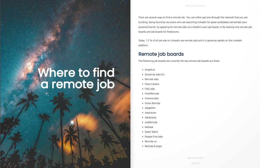 This is a guide with tips on how to find a remote job, how to take ownership of your career, how to stand out from the crowd, tips for remote interviews, why you should build multiple income streams, how to adapt to change and thrive in the future of work, and so much more...